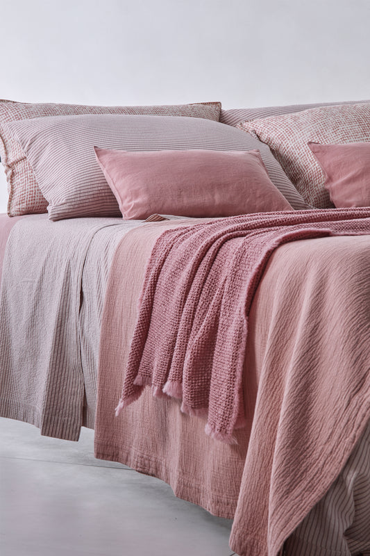 Crisp and crinkled, PAR flat sheet in pure cotton features a geometric, regular pattern embellished by slightly embossed, yarn-dyed stripes. Ideal for decorating a cool bed for the warmer season, this sheet can be matched with plain or printed pillow cases and sheets, creating multiple layers of different fabrics and textures.
