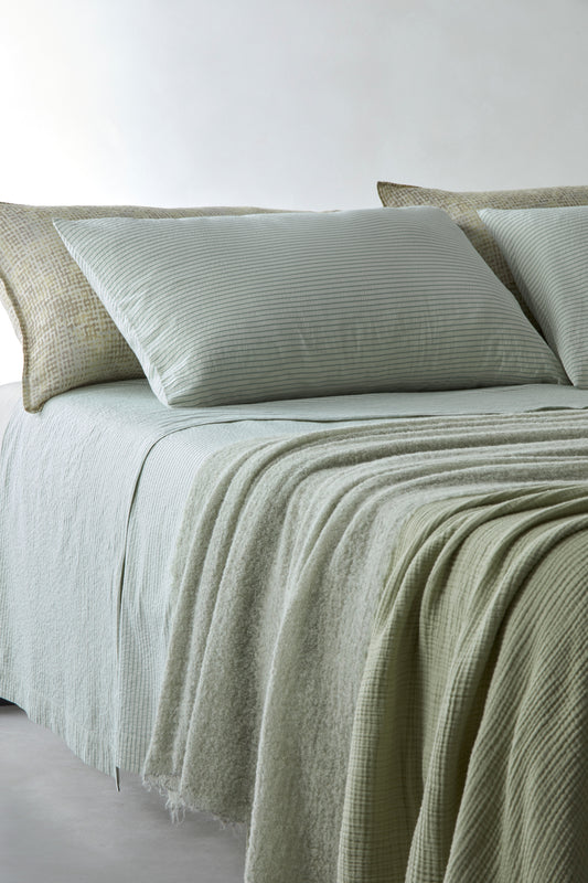 Crisp and crinkled, PAR flat sheet in pure cotton features a geometric, regular pattern embellished by slightly embossed, yarn-dyed stripes. Ideal for decorating a cool bed for the warmer season, this sheet can be matched with plain or printed pillow cases and sheets, creating multiple layers of different fabrics and textures